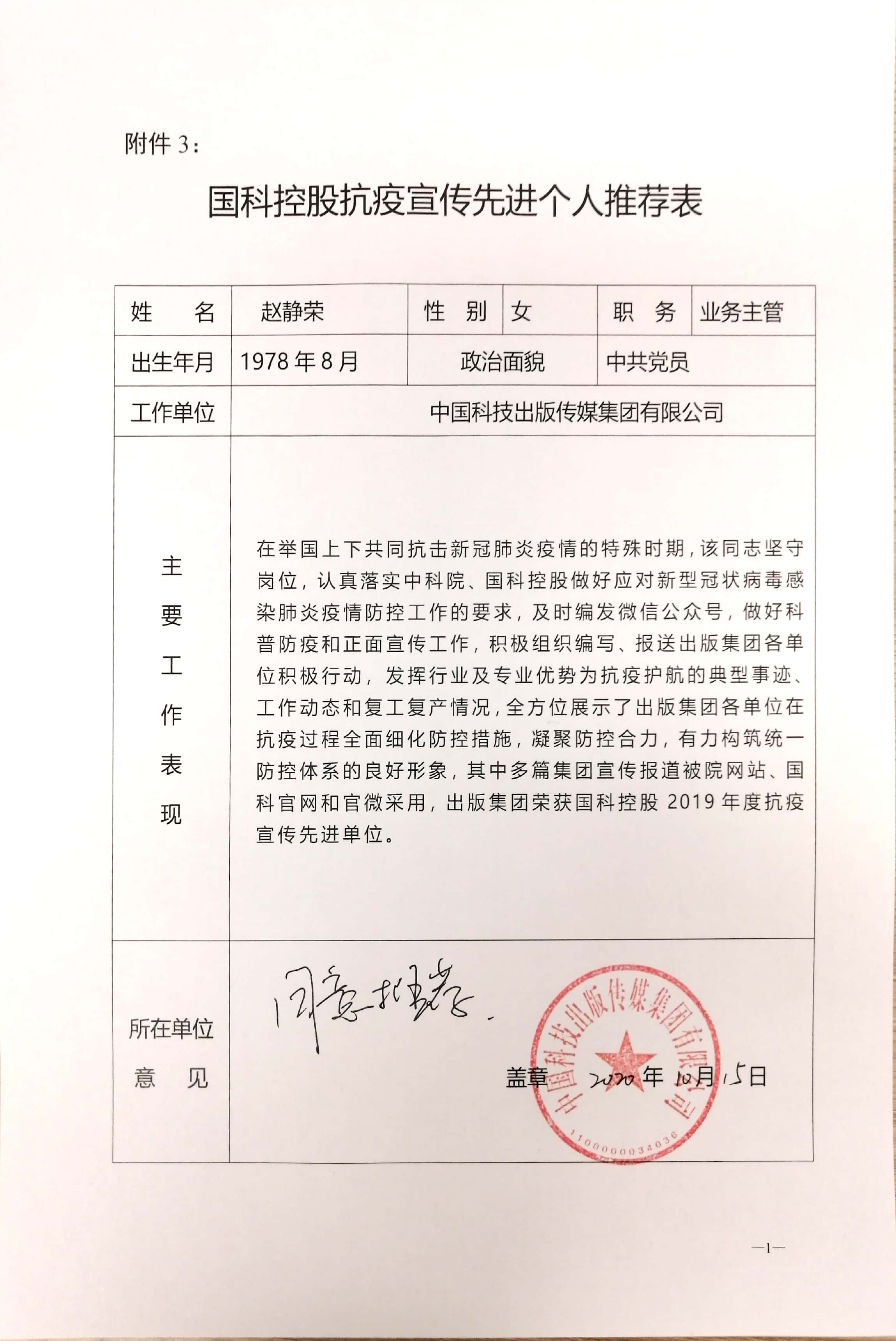 國科控股抗疫宣傳先進(jìn)個(gè)人推薦表