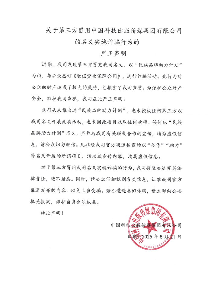 關(guān)于第三方冒用中國科技出版傳媒集團有限公司的名義實(shí)施詐騙行為的嚴正聲明